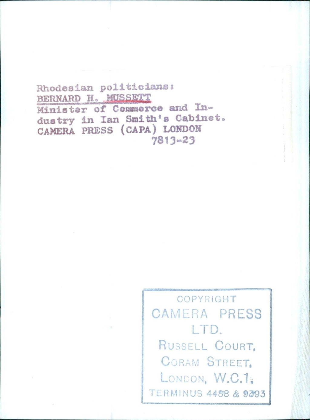 A portrait of BERNARD H. MUSSETT, the Minister of Commerce and Industry in Ian Smith's Cabinet. A portrait of BERNARD H. MUSSETT, the Minister of Commerce and Industry in Ian Smith's Cabinet.