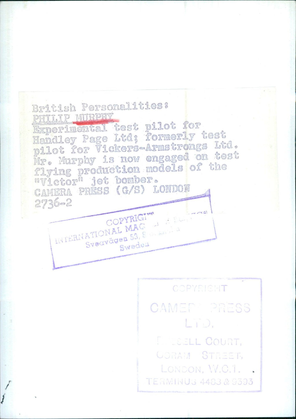 Experimental test pilot for Handley Page Ltd; formerly test pilot for Vickers-Armstrongs Ltd. Mr. Murphy is now engaged on test flying production models of the "Victor" jet bomber. Experimental test pilot for Handley Page Ltd; formerly test pilot for Vickers-Armstrongs Ltd. Mr. Murphy is now engaged on test flying production models of the "Victor" jet bomber.