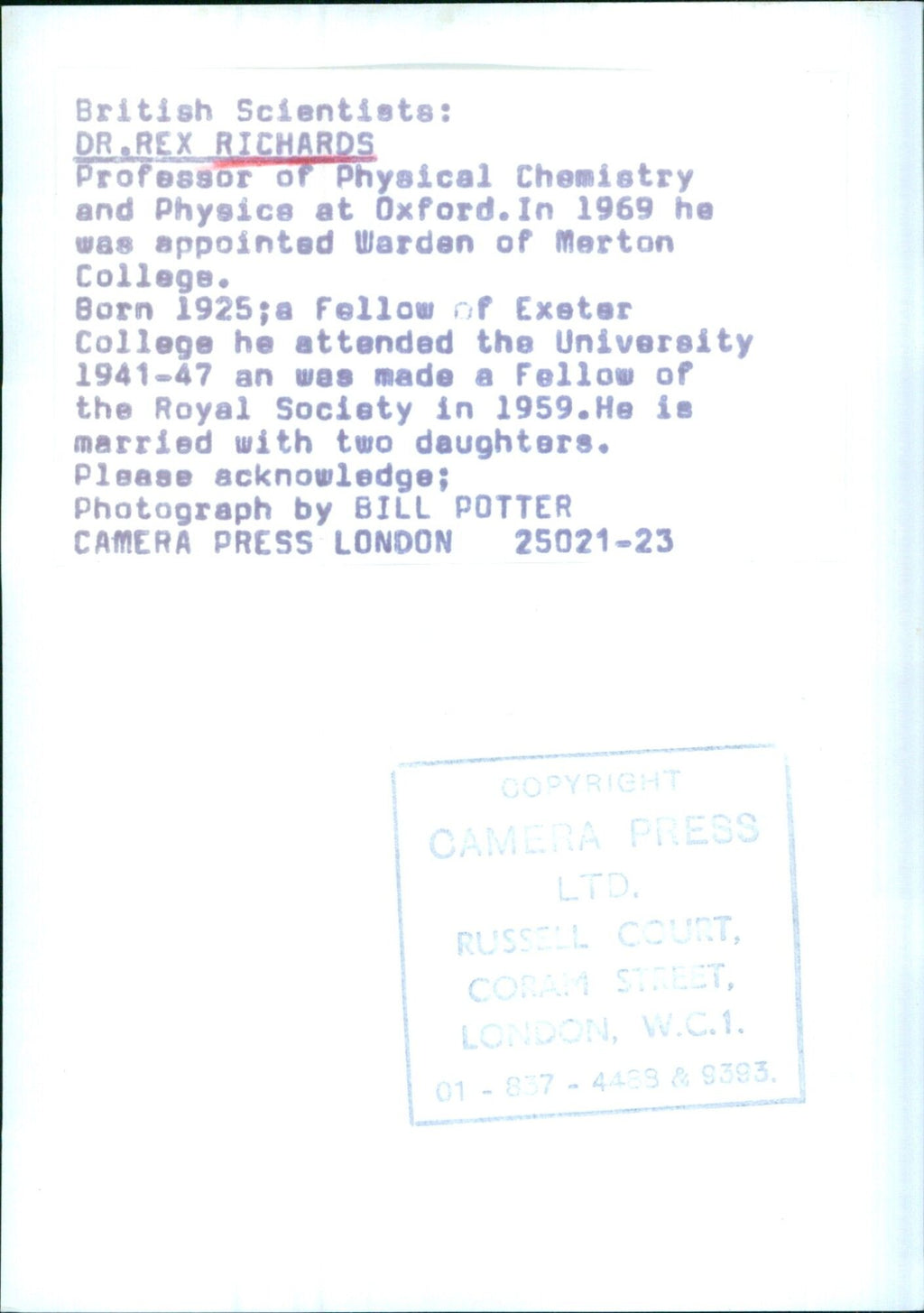 Dr. Rex Richards is a Professor of Physical Chemistry and Physics at Oxford University. He was appointed Warden of Merton College in 1969. Born in 1925, he attended the University from 1941 to 1947 and became a Fellow of the Royal Society in 1959. He is married with two daughters. Dr. Rex Richards is a Professor of Physical Chemistry and Physics at Oxford University. He was appointed Warden of Merton College in 1969. Born in 1925, he attended the University from 1941 to 1947 and became a Fellow of the Royal Society in 1959. He is married with two daughters.