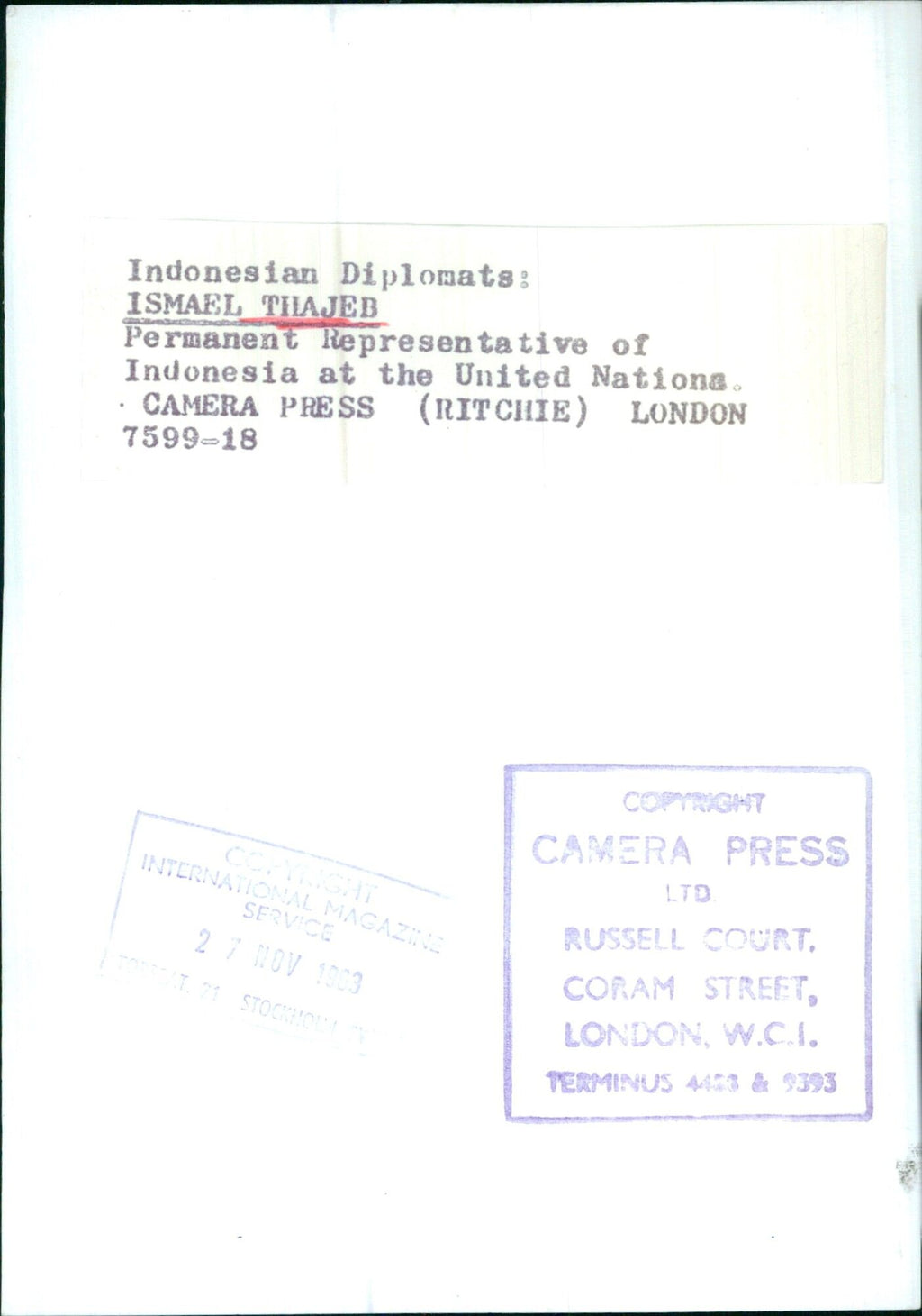A photograph of ISMAEL THAJEB, the Permanent Representative of Indonesia at the United Nations. The image was taken by CAMERA PRESS (RITCHIE) LONDON. A photograph of ISMAEL THAJEB, the Permanent Representative of Indonesia at the United Nations. The image was taken by CAMERA PRESS (RITCHIE) LONDON.