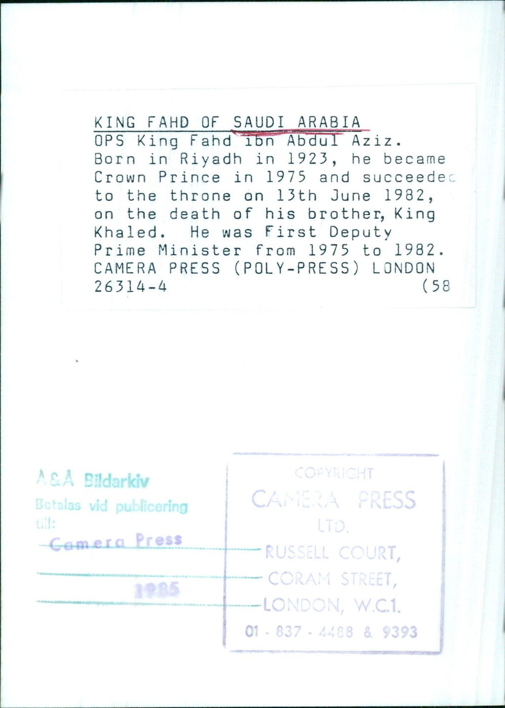 King Fahd ibn Abdul Aziz was born in 1923 in Riyadh and served as First Deputy Prime Minister from 1975 to 1982. He was crowned King of Saudi Arabia on 13th June 1982, following the death of his brother, King Khaled. This photograph was taken in 1985 by the London-based agency Camera Press. King Fahd ibn Abdul Aziz was born in 1923 in Riyadh and served as First Deputy Prime Minister from 1975 to 1982. He was crowned King of Saudi Arabia on 13th June 1982, following the death of his brother, King Khaled. This photograph was taken in 1985 by the London-based agency Camera Press.