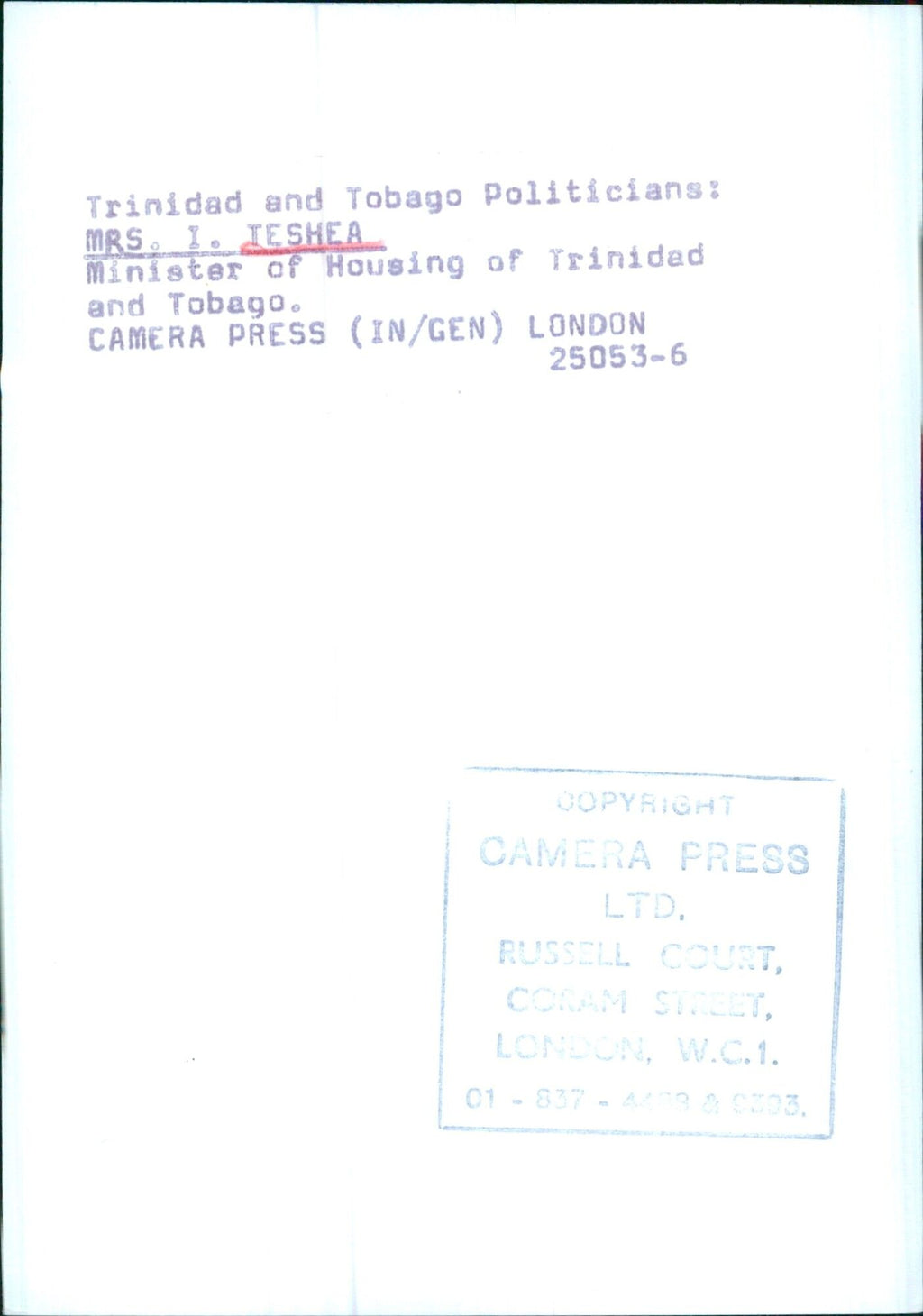 A portrait of MRS. I. TESHEA, the Minister of Housing of Trinidad and Tobago. A portrait of MRS. I. TESHEA, the Minister of Housing of Trinidad and Tobago.