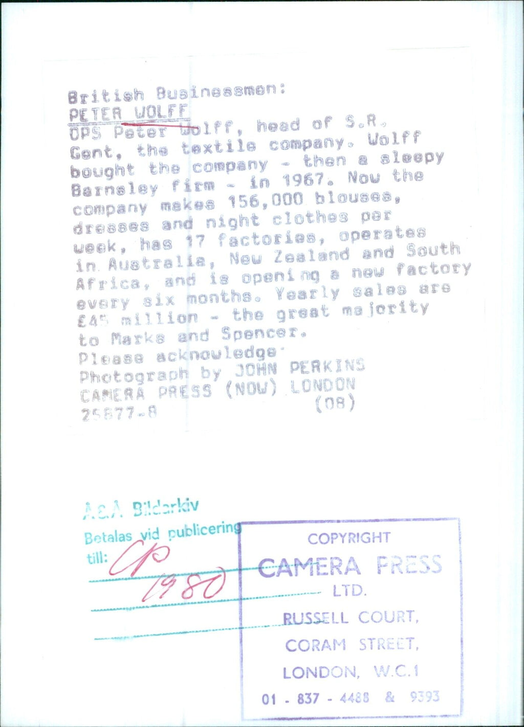 Peter Wolff, head of S.R. Gent, a textile company that he bought in 1967. The company now produces 156,000 blouses, dresses, and night clothes per week, with 17 factories operating in Australia, New Zealand, and South Africa. They are opening a new factory every six months, with yearly sales reaching £45 million, primarily to Marks and Spencer. Peter Wolff, head of S.R. Gent, a textile company that he bought in 1967. The company now produces 156,000 blouses, dresses, and night clothes per week, with 17 factories operating in Australia, New Zealand, and South Africa. They are opening a new factory every six months, with yearly sales reaching £45 million, primarily to Marks and Spencer.