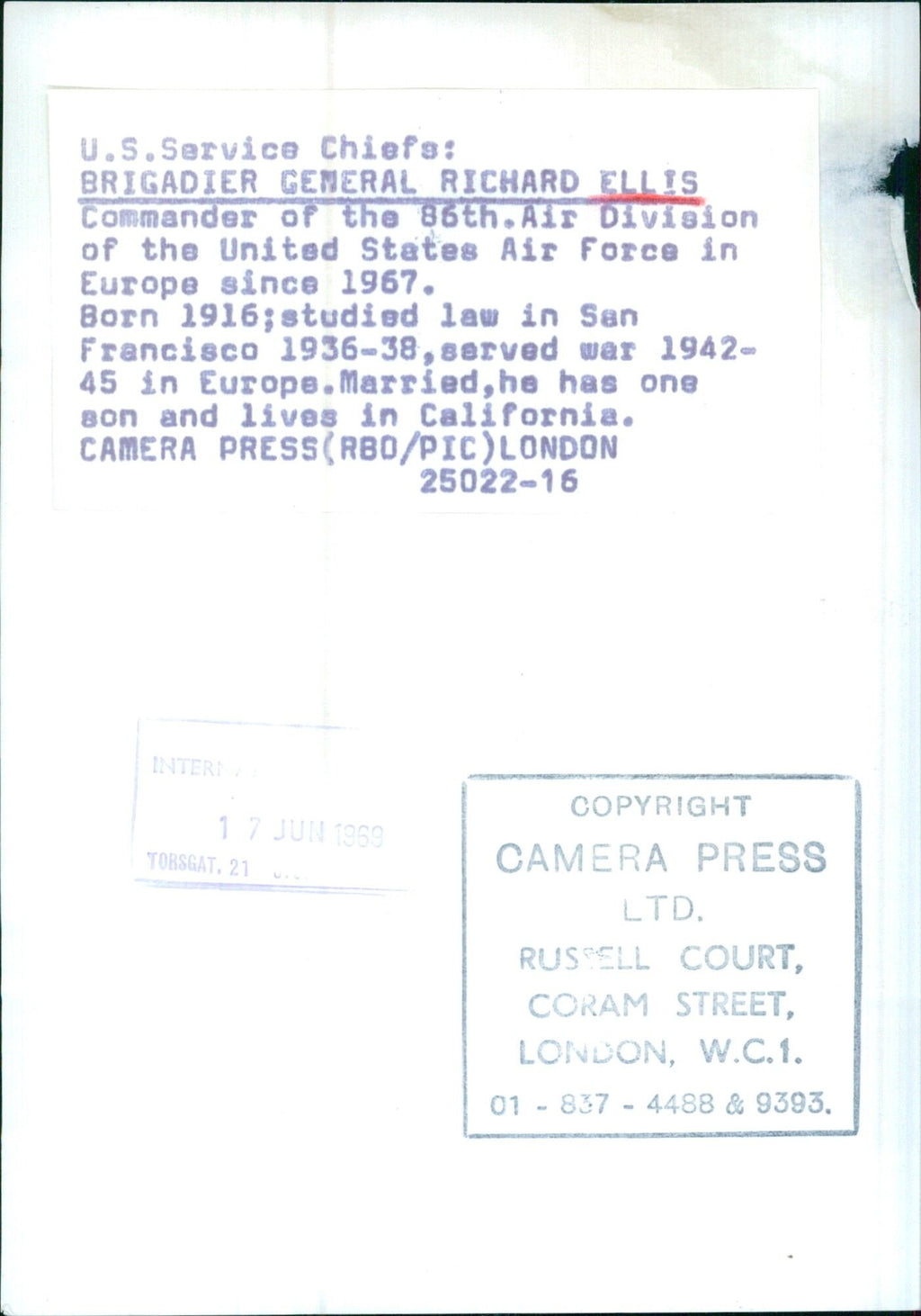 Brigadier General Richard Ellis, Commander of the 86th Air Division of the United States Air Force in Europe since 1967. Born in 1916; studied law in San Francisco from 1936-38, served in the war in Europe from 1942-45. Married with one son and resides in California. Brigadier General Richard Ellis, Commander of the 86th Air Division of the United States Air Force in Europe since 1967. Born in 1916; studied law in San Francisco from 1936-38, served in the war in Europe from 1942-45. Married with one son and resides in California.