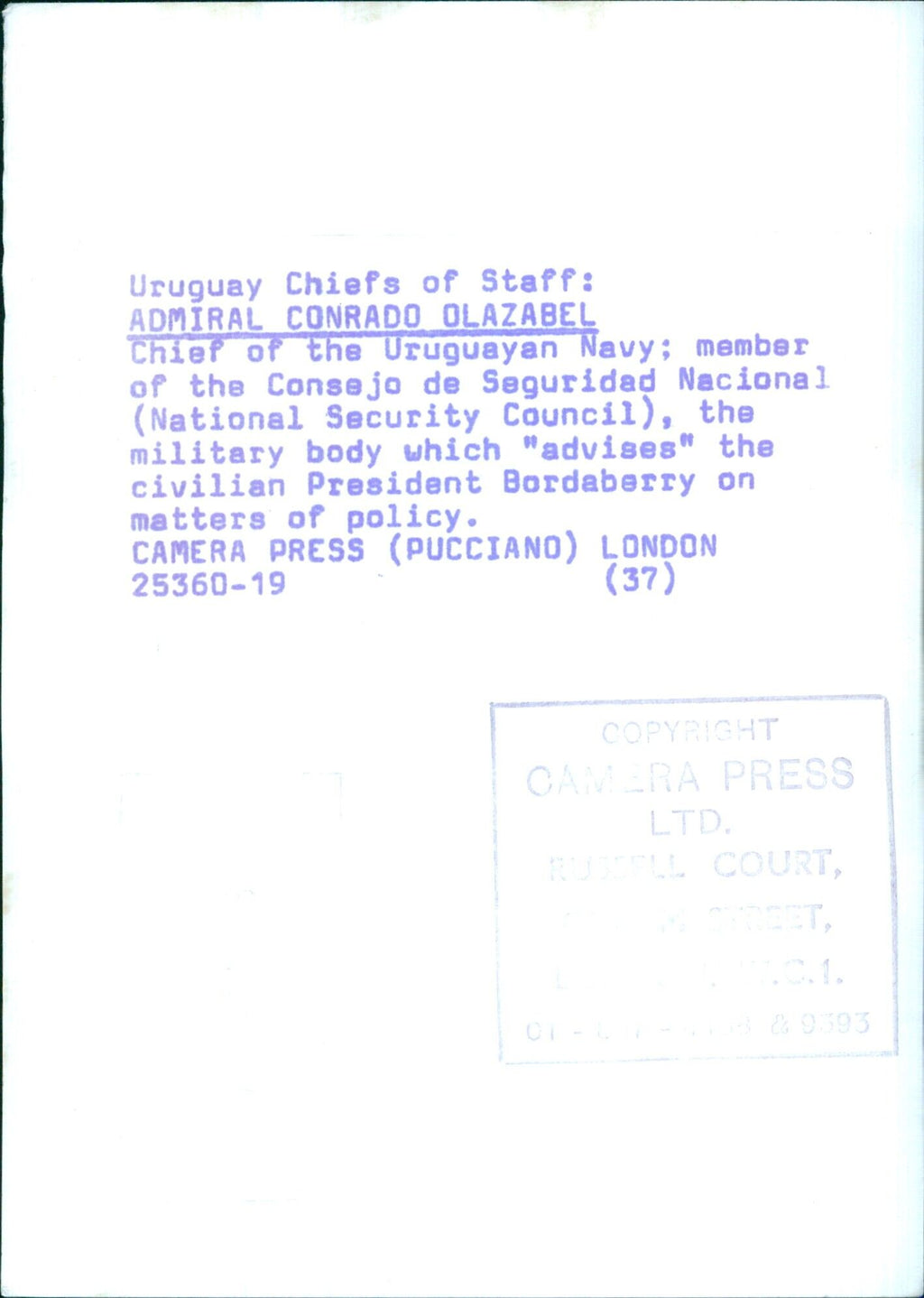 Admiral Conrado Olazabel, Chief of the Uruguayan Navy and member of the National Security Council, is photographed. The council provides advice to the civilian President Bordaberry regarding military issues. Admiral Conrado Olazabel, Chief of the Uruguayan Navy and member of the National Security Council, is photographed. The council provides advice to the civilian President Bordaberry regarding military issues.
