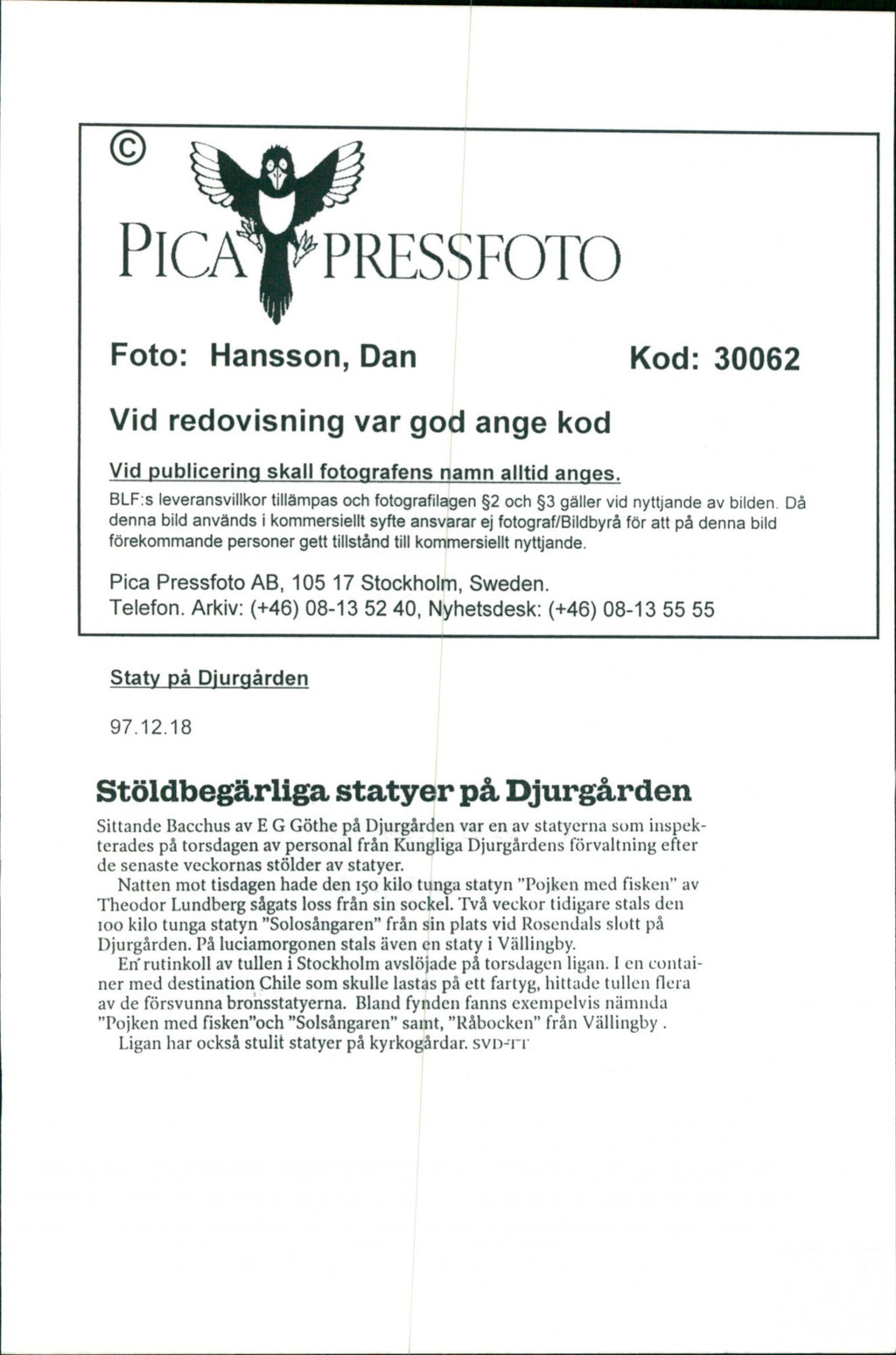 Stateless statues at Djurgården Sitting Bacchus by EG Göthe at Djurgården was one of the statues inspected on Thursday by staff from Kungliga Djurgården's administration following the theft of statues in recent weeks.