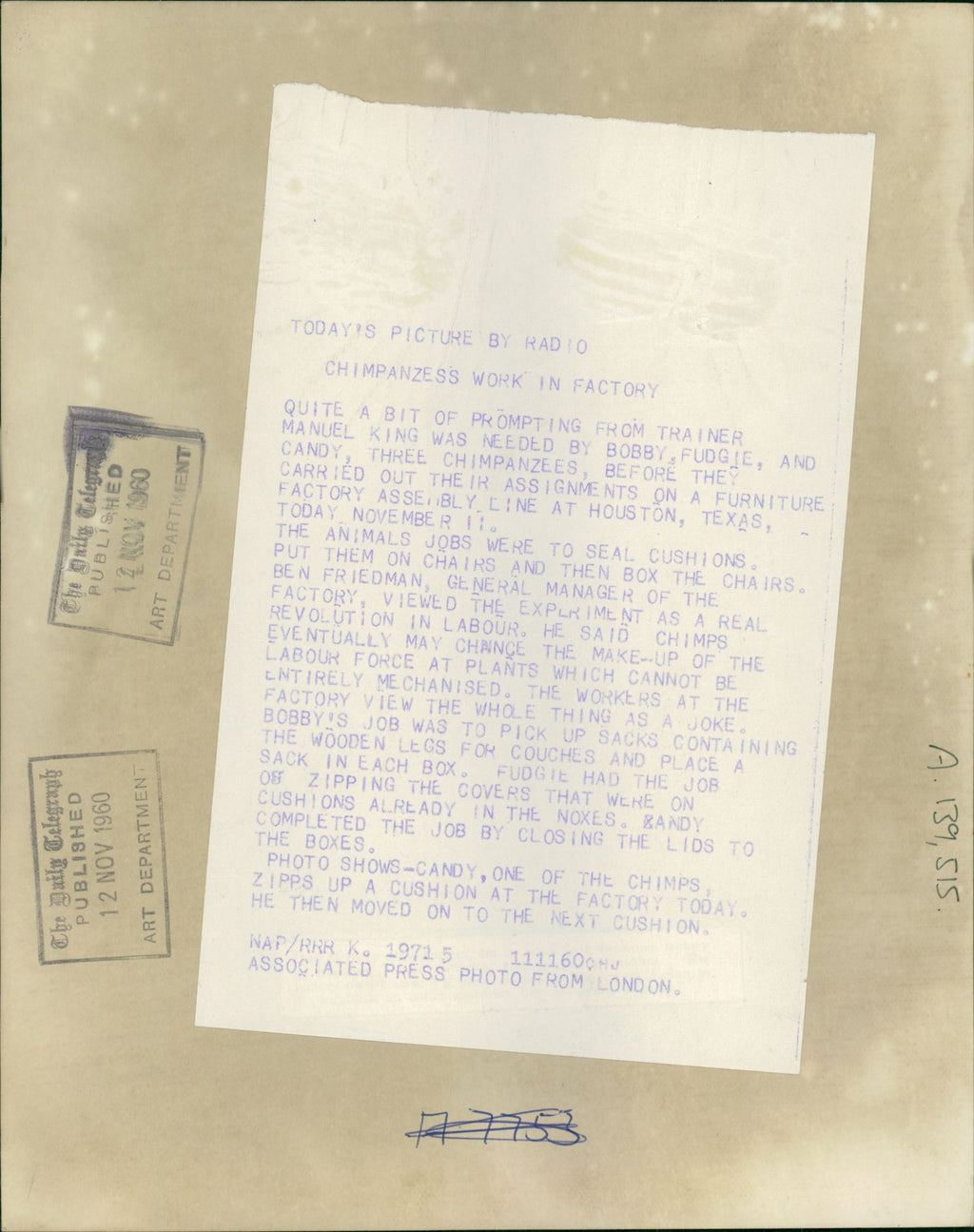 All our press photos are LIMITED ARCHIVE ORIGINALS - they are the actual prints that were used by the newspapers, they are not reprints or digital prints produced by us. All the prints are at least 30 years old and up to 100 years old.