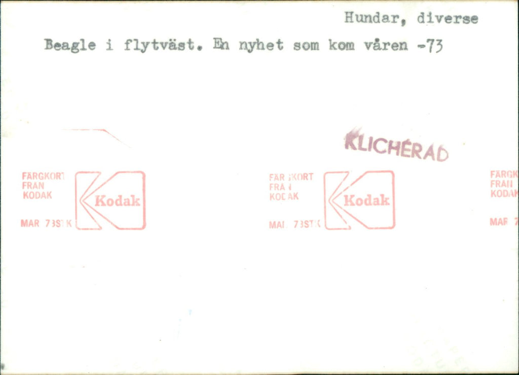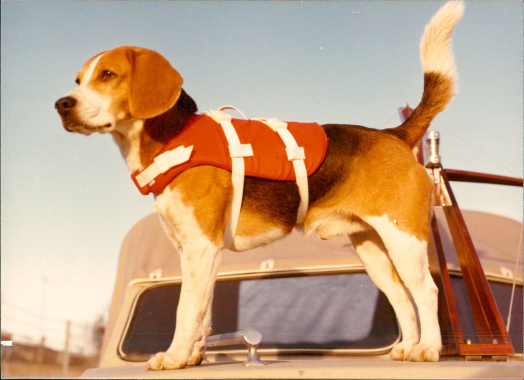 Beagle in life jacket. A news that came in the spring of -73