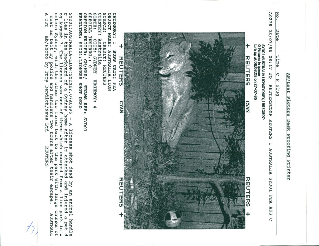 Animal: Lion: A lioness shot dead by an animal handler lies in the backyard of a Sydney home after it attacked and injured a pet dog. The lioness was one of the three which escaped from a lion park in Western Sydney, with the other two lured back to the park with a large chunks of meat as bait by police and handlers two hours after their escape. Animal: Lion: A lioness shot dead by an animal handler lies in the backyard of a Sydney home after it attacked and injured a pet dog. The lioness was one of the three which escaped from a lion park in Western Sydney, with the other two lured back to the park with a large chunks of meat as bait by police and handlers two hours after their escape.