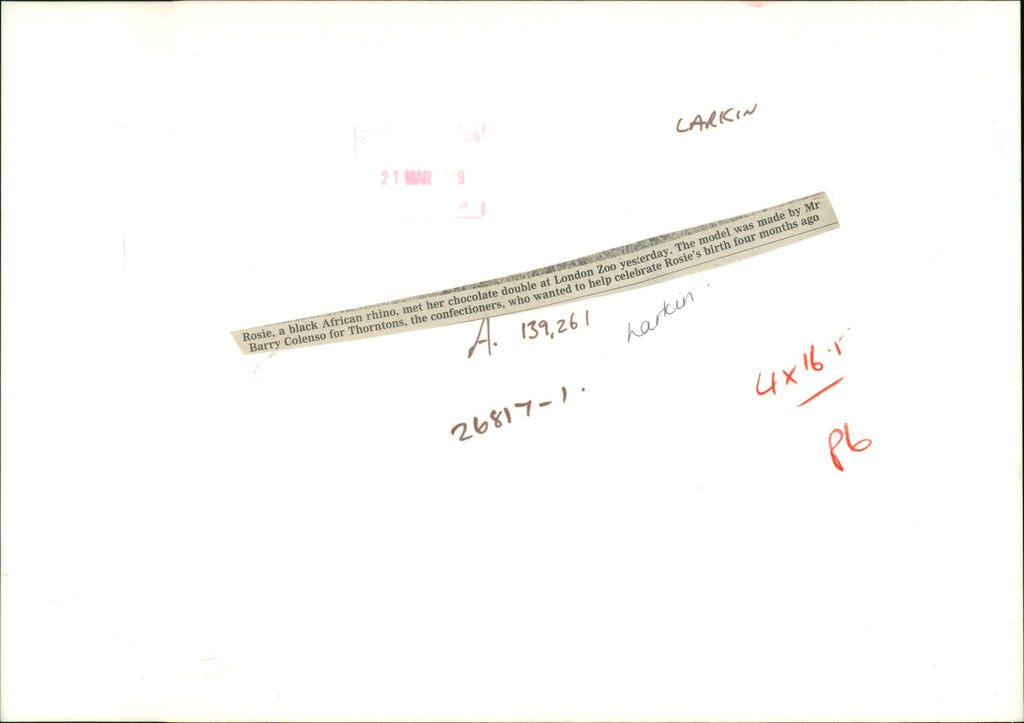 Rosie, a black African rhino, met her chocolate double at London Zoo yesterday. The model was made by Mr Barry Colenso for Thorntos, the confectioners, who wanted to help celebrate Rosie's birth four months ago. Rosie, a black African rhino, met her chocolate double at London Zoo yesterday. The model was made by Mr Barry Colenso for Thorntos, the confectioners, who wanted to help celebrate Rosie's birth four months ago.