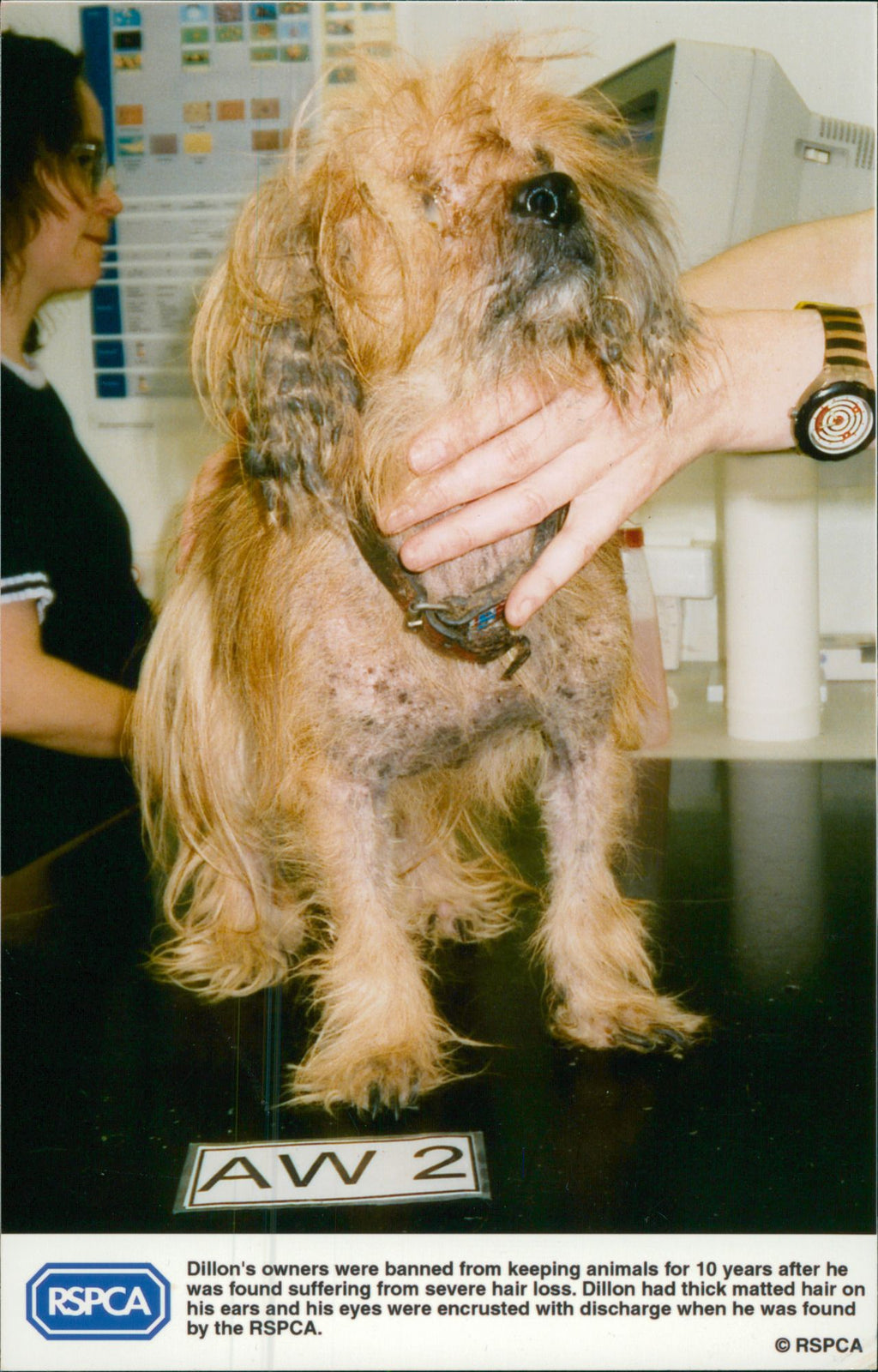 Dillon's owner were banned from keeping animals for 10 years after he was found suffering from severe hair loss. Dillon's owner were banned from keeping animals for 10 years after he was found suffering from severe hair loss.