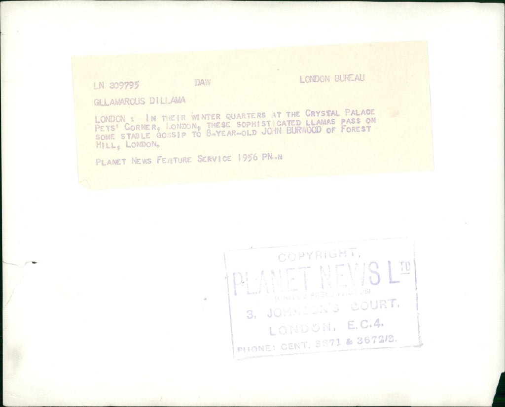 IN THEIR WINTER QUARTERS AT THE CRYSTAL PALAGE PET'S CORNER, LONDON, THESE SOPHISTICATED LLAMAS PASS ON SOME STABLE GOSSIP TO 8 YEARS OLD JOHN BURWOOD IN THEIR WINTER QUARTERS AT THE CRYSTAL PALAGE PET'S CORNER, LONDON, THESE SOPHISTICATED LLAMAS PASS ON SOME STABLE GOSSIP TO 8 YEARS OLD JOHN BURWOOD