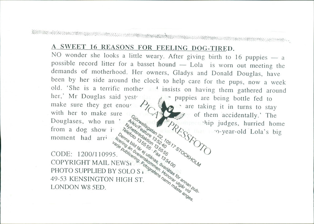 After giving birth to 16 puppies, a possible record litter for a basket of hound, Lola is worn out meeting the demands of motherhood. The puppies are being bottle fed to make sure they get enough milk.