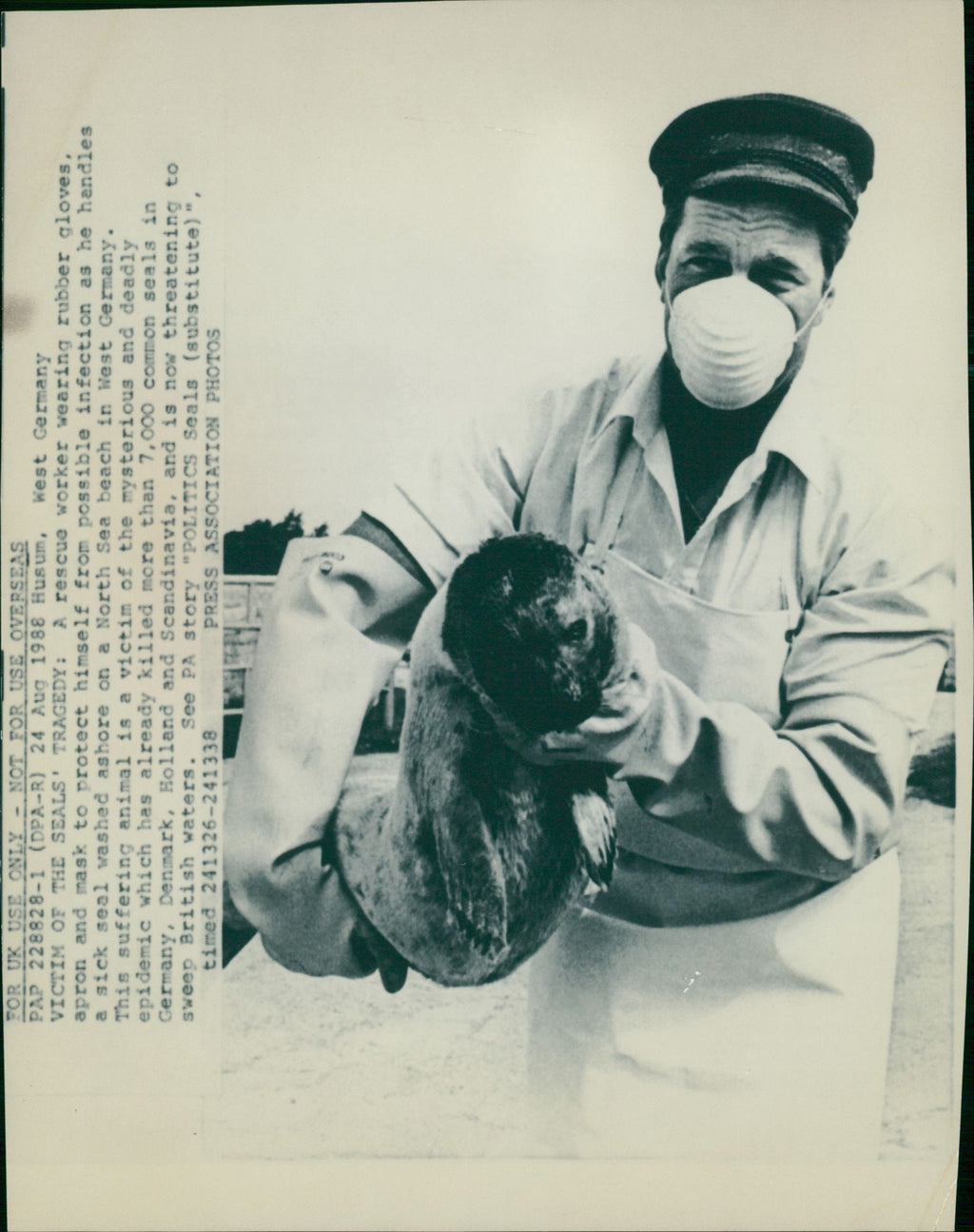 A rescue worker wearing rubber gloves, apron and mask to protect himself from possible infection as he handles a sick seal washed ashore on a North beach in West Germany. A rescue worker wearing rubber gloves, apron and mask to protect himself from possible infection as he handles a sick seal washed ashore on a North beach in West Germany.