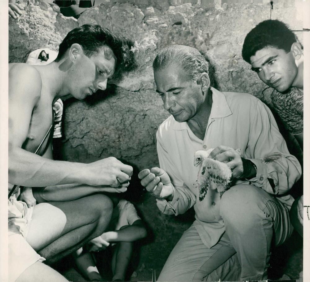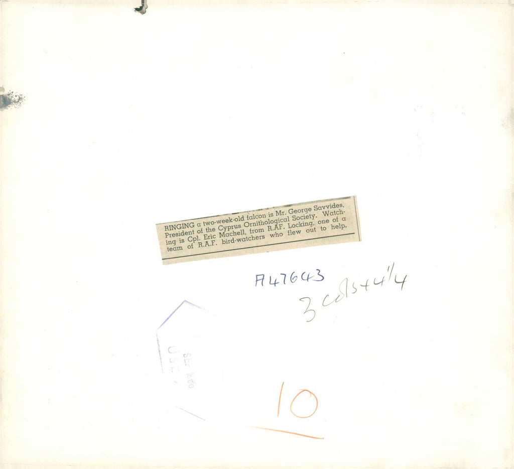Ringing a two-week-old falcon is Mr. George Savvides, President of the Cyprus Ornithological Society. Watching is Cpl. Eric Machell, from R.AF. Locking, on of a team of R.A.F. bird- watchers who flew out to help. Ringing a two-week-old falcon is Mr. George Savvides, President of the Cyprus Ornithological Society. Watching is Cpl. Eric Machell, from R.AF. Locking, on of a team of R.A.F. bird- watchers who flew out to help.