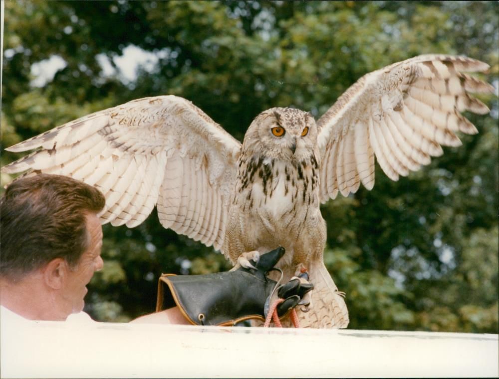 Pernod, a European Eagle owl, spreads its wings in David's hand