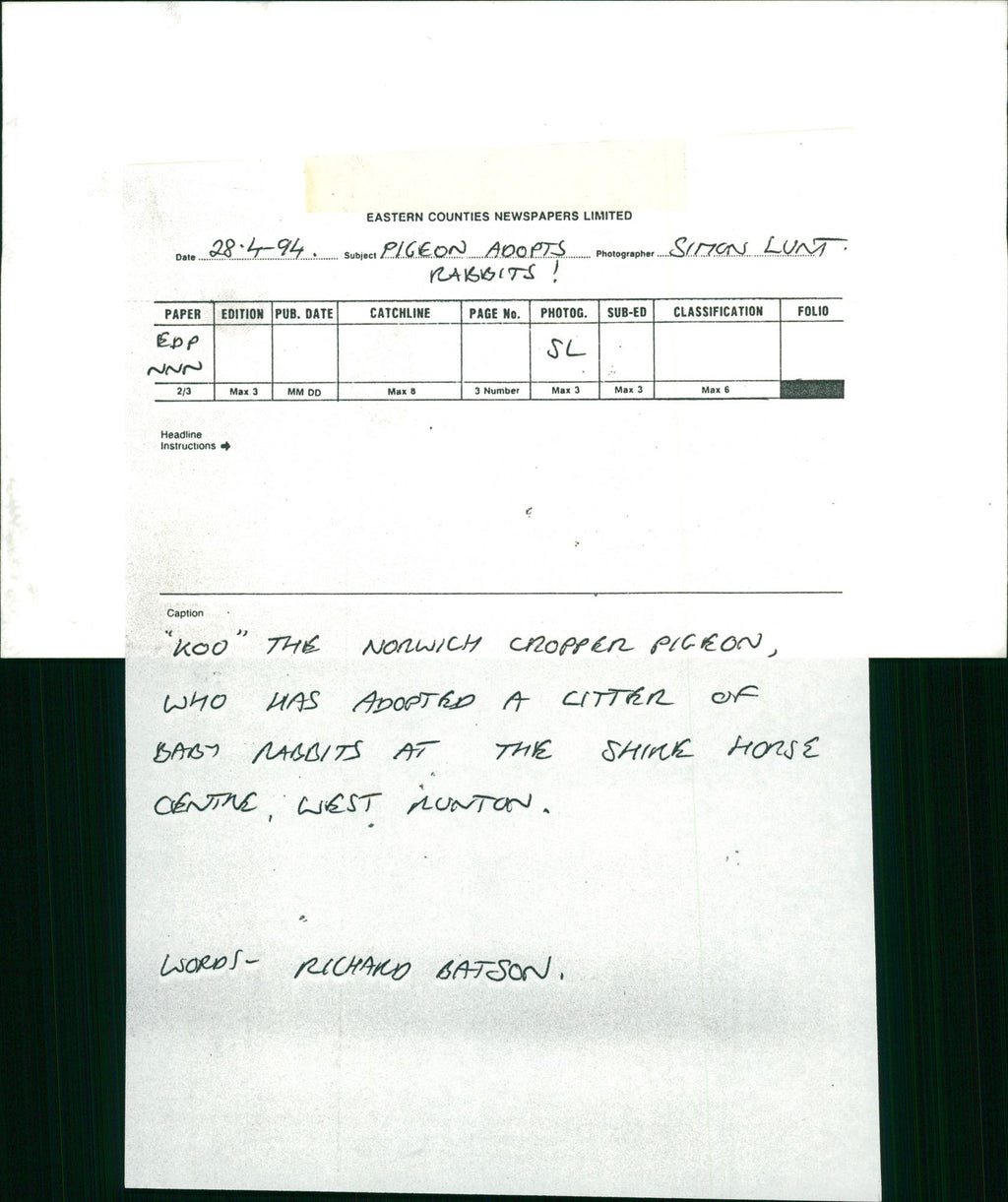 "Koo" the Norwich cropper pigeon, who has adopted a litter of baby rabbits at the Shire Horse Centre, West Runton. "Koo" the Norwich cropper pigeon, who has adopted a litter of baby rabbits at the Shire Horse Centre, West Runton.