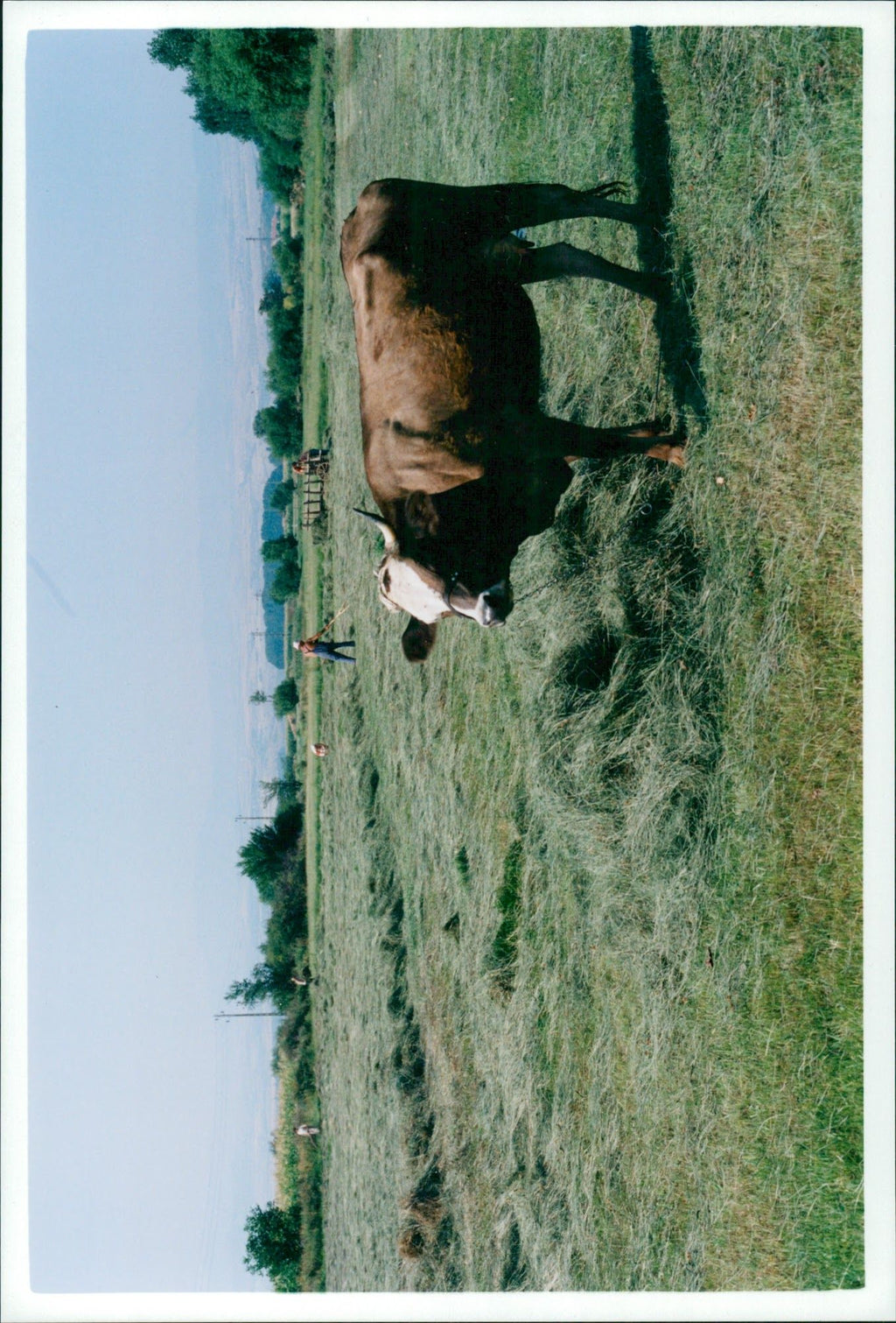 Bulgaria Agriculture. A cow on a meadow during hay harvest - Vintage Photograph