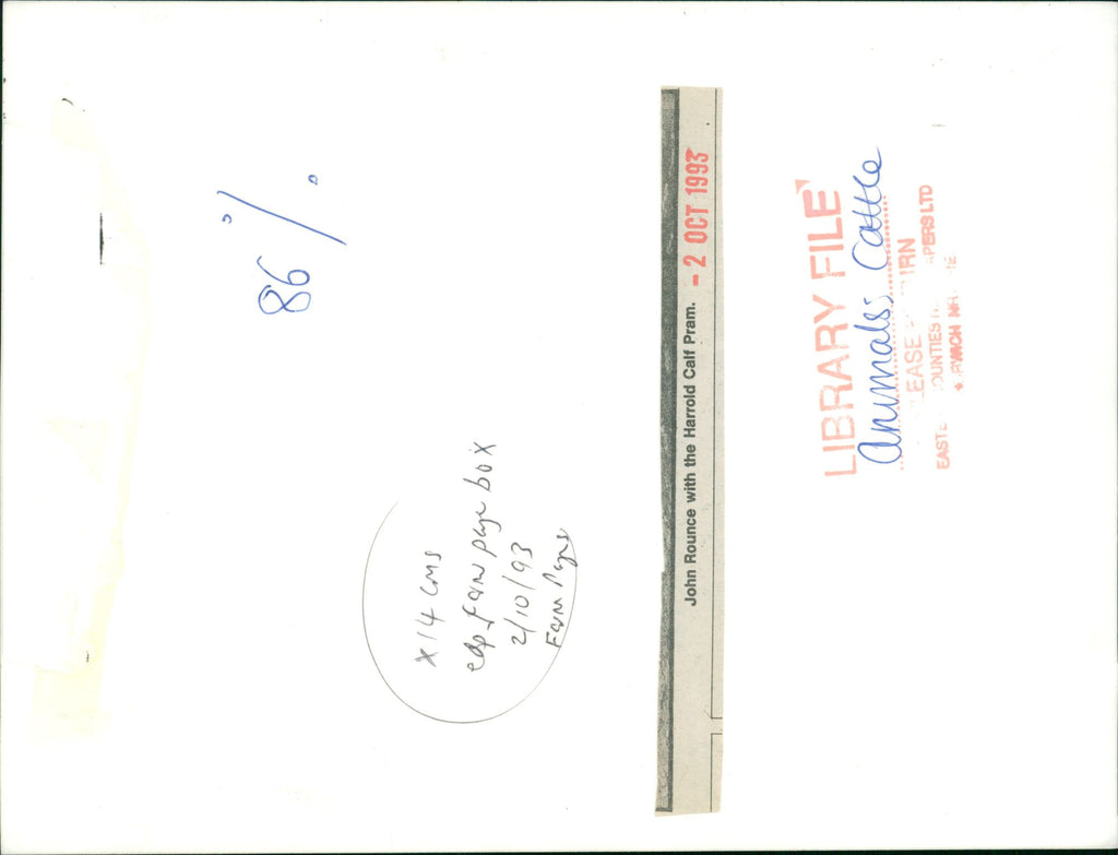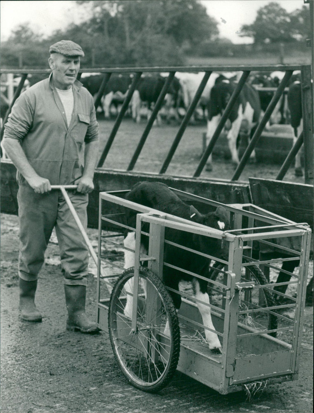 Cattle animals:john rounce with the harold calf pram. - Vintage Photograph