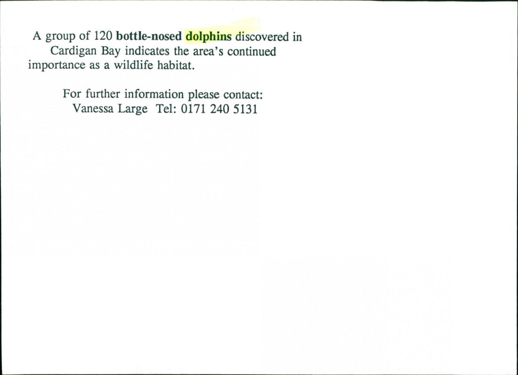 A group of 120 bottle-nosed dolphins discovered in Cardigan Bay indicates the area's continued importance as a wildlife habitat. Foir further information please contact: Vanessa Large