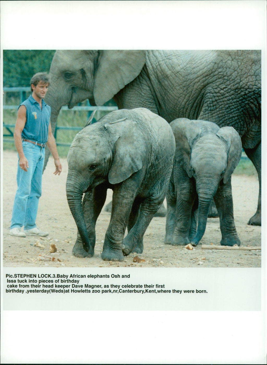 Baby African elephants and Issa tuck into pieces of birthday cake from their head keeper Dave Magner, as they celebrate their first birthday, yesterday (Weds) at Howllets zoo park,nr,Canterbury,Kent, where they were born. Baby African elephants and Issa tuck into pieces of birthday cake from their head keeper Dave Magner, as they celebrate their first birthday, yesterday (Weds) at Howllets zoo park,nr,Canterbury,Kent, where they were born.