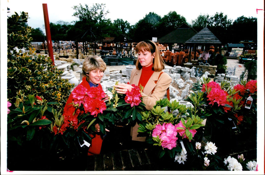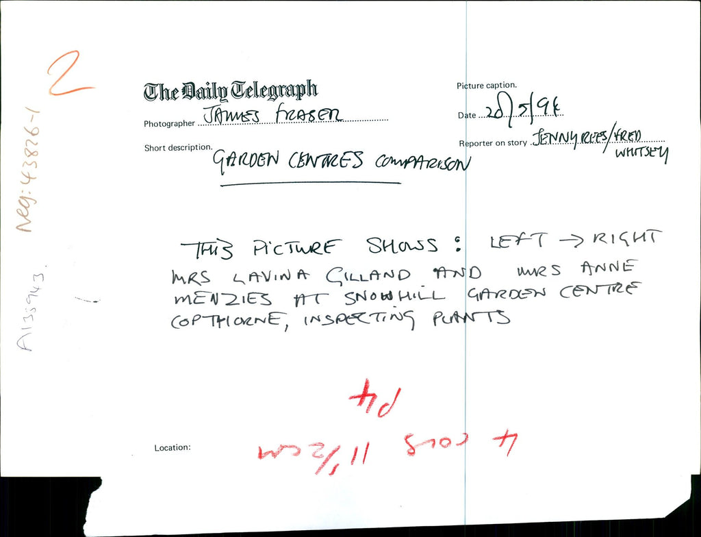 Mrs Lavina Gilland and Mrs Anne Menzies at Snowhill Garden Centre Copthorne, inspecting plants. Mrs Lavina Gilland and Mrs Anne Menzies at Snowhill Garden Centre Copthorne, inspecting plants.