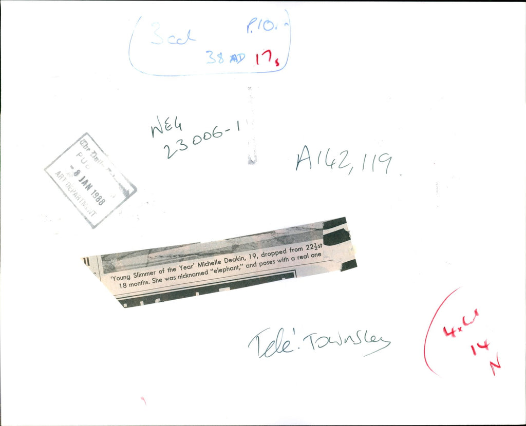 Young Slimmer of the Year' Michelle Deakin, 19, dropped from 22 1/2st 18 months. She was nicknamed "elephant" and poses with a real one. Young Slimmer of the Year' Michelle Deakin, 19, dropped from 22 1/2st 18 months. She was nicknamed "elephant" and poses with a real one.