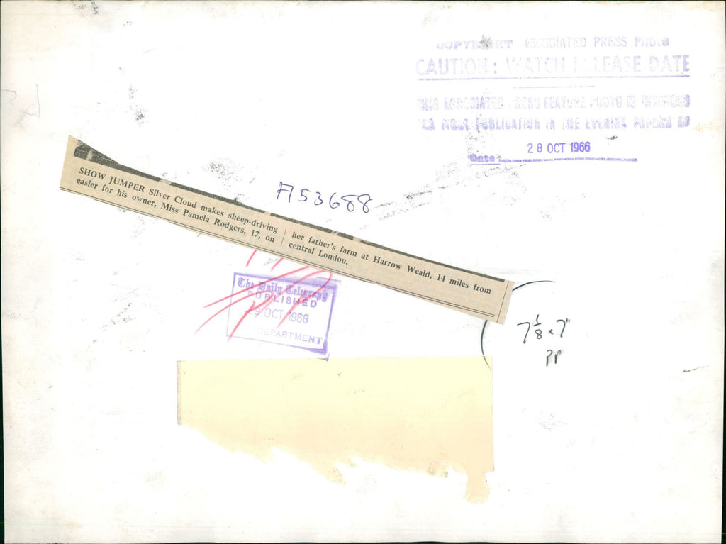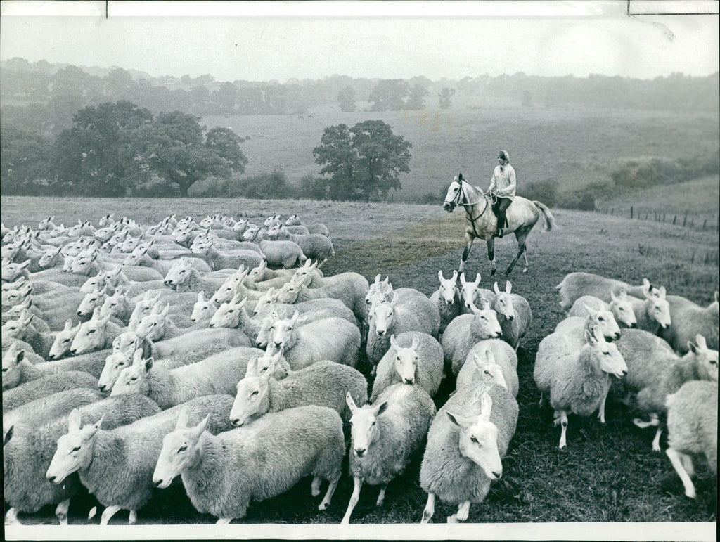 Miss Pamela Rodgers: Show jumper Silver Cloud makes sheep-driving easier for his owner, Miss Pamela Rodgers on her father's farm at Harrow Weald, 14 miles from central London. Miss Pamela Rodgers: Show jumper Silver Cloud makes sheep-driving easier for his owner, Miss Pamela Rodgers on her father's farm at Harrow Weald, 14 miles from central London.