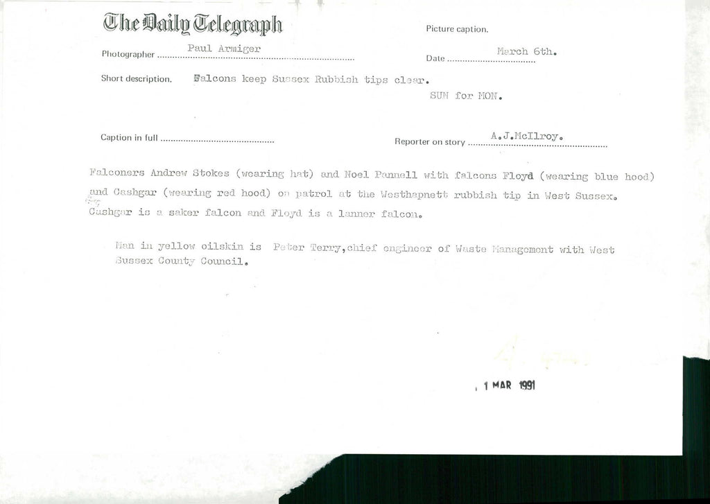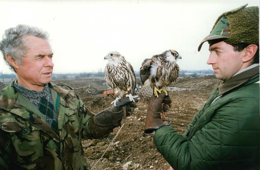 Palconers Andrew Stokes (wearing hat) and. Noel Pannell with falcons Floyd. - Vintage Photograph