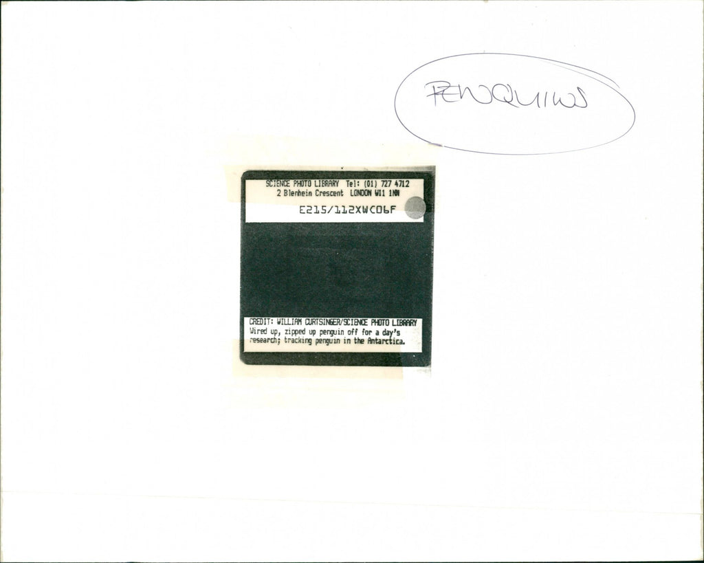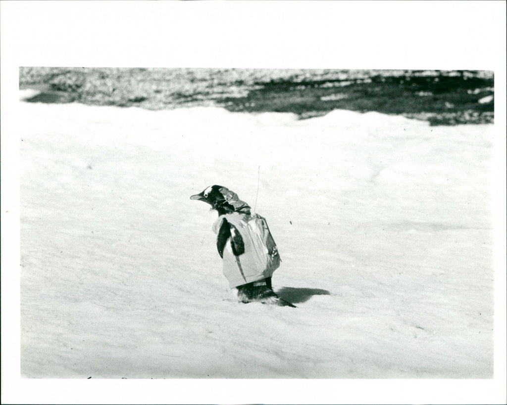 Penguins. Wired up, zipped up penguin off for a day's research; tracking penguin in the Antarctica. Credit: William Curtsinger/Science Photo Library