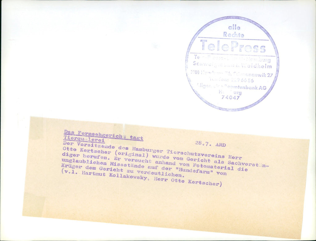 The chairman of the Hamburg animal welfare association, Mr. Otto Kertscher (original), was appointed by the court as an expert. He tried to explain the unbelievable grievances on the "dog farm" of Krüger to the court using photo material. (from left Hartmut Kollakowsky, Mr. Otto Kertscher)
