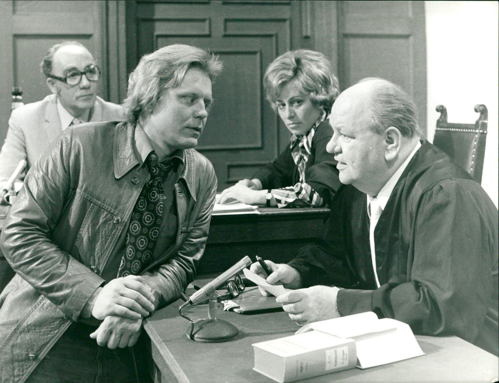 The defendant Helmut Krüger (Hartmut Kollakowsky) discusses with his lawyer. In an appeal hearing before the large criminal chamber of the television court, there is a case of "cruelty to animals". The unskilled worker Helmut Krüger, with several criminal records, has opened a dog farm on the outskirts of Hamburg after other unsuccessful business ventures. Gross neglect of the animals and fraudulent information given to some customers resulted in a penalty of several months. He has appealed against this.