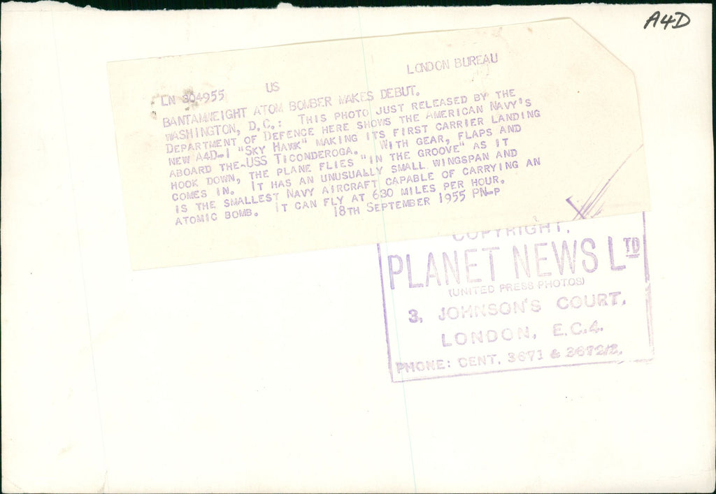 Aircraft: Military: This photo released by the Department of Defence here shows the American Navy's A4D-1 "Sky Hawk" making its first carrier landing aboard the USS Ticonderoga. With gear, flaps and hook down, the plane flies in the Groove as it comes in. It has unusually small wingspan and is the smallest of the Navy aircraft capable of carrying and atomic bomb. It can fly at 630 miles per hour.