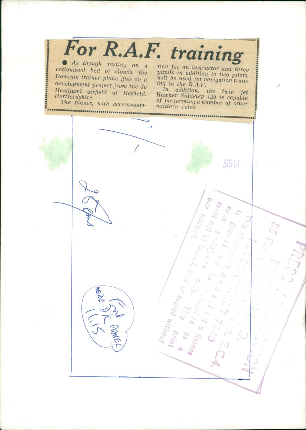 As though resting on a cottonwool bed of clouds. the Dominie trainer plane flies on a developmenet project from the de Havilland airfield at Hatfield, Hertfordshire. The plane with accommodation for an instructor and three pupils in addition to two pilots, will be used for navigation training in the R.A.F. In addtion, the twin jet Hawker Siddeley 125 is capable of performing a number of other military roles.