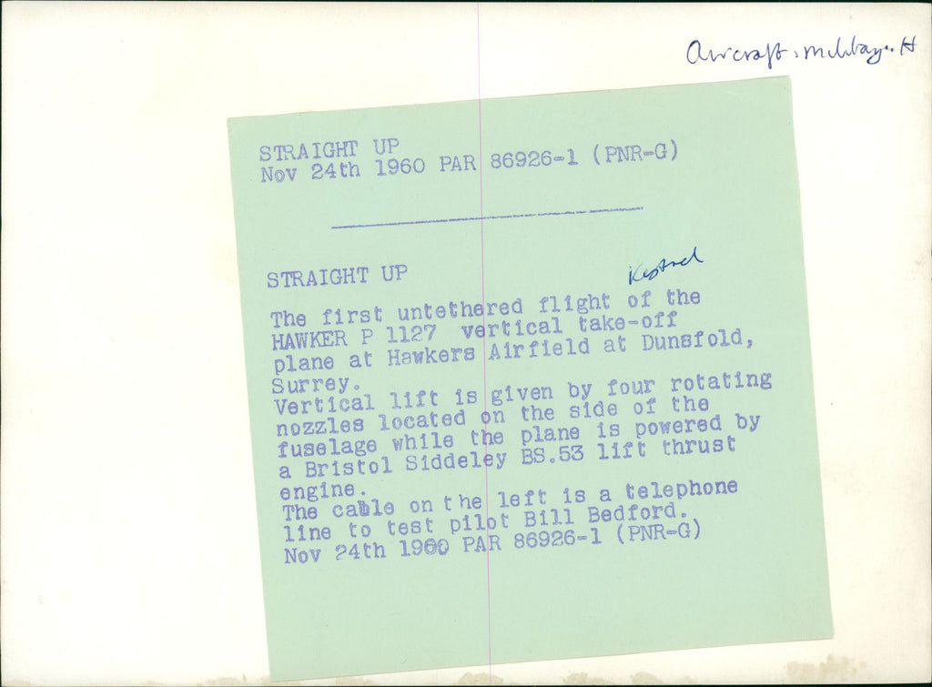 The first untethered flight of the HAWKER P 1127 vertical take-off plane at Hawkers Airfield at Dunsfold, Surrey.