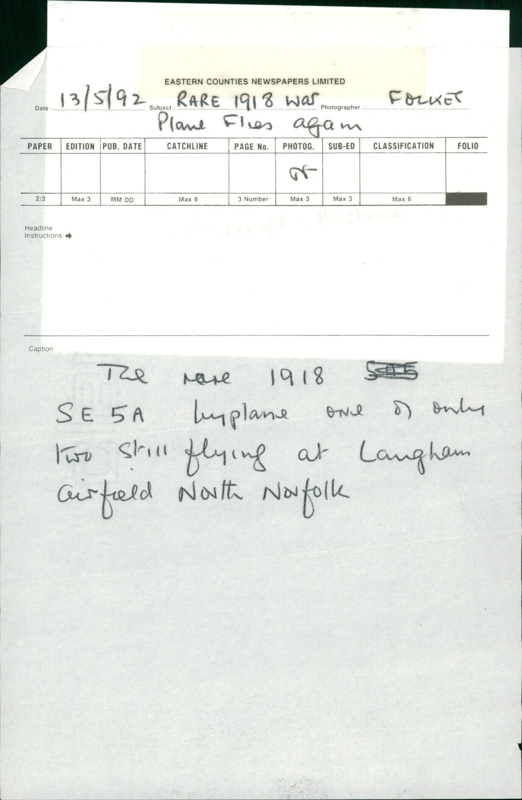 The name 1918 SE5A byplane one of only two skill flying at Langham Airfield North Norfolk.