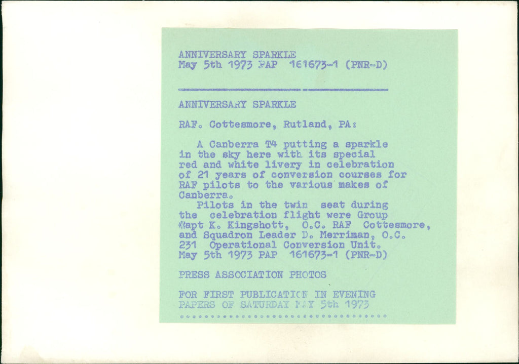 A Canberra T4 putting a sparkle in the sky here with its special red and white livery in celebration of 21 years of conversion courses for RAF pilots to the various makes of Canberra.