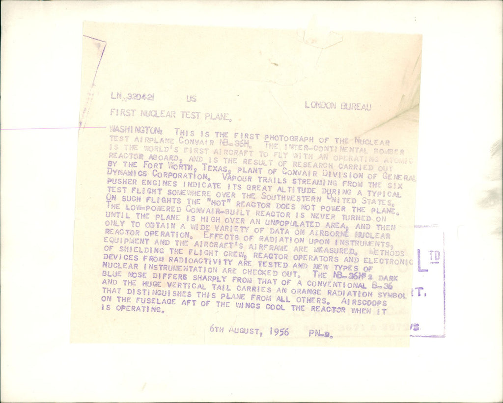 This is the first photograph of the First Nuclear Test Airplane Convair NB-36H. The Inter-continental bomber is the world's first aircraft to fly with an operating atomic reactor aboard, and is the result of research carried out by the Fort Worth, Texas, plant of Convair Division of General Dynamics Corporation.