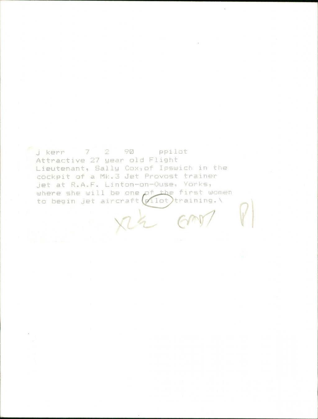 Flight Lieutenant Sally Cox of Ipswich in the cockpit of an MK.3 Jet Provost as one of the first women to begin jet aircraft pilot training.