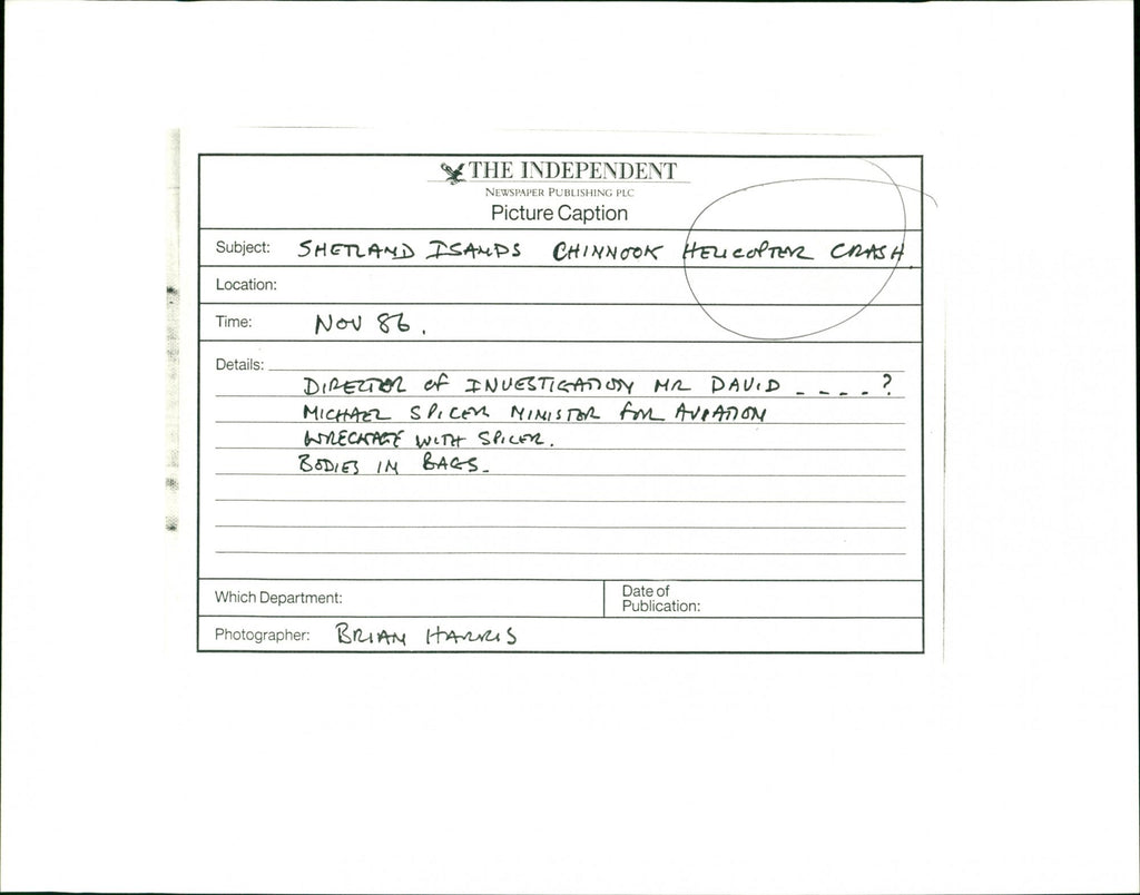 The Independent Newspaper Publishing PLC Picture Caption, Subject: Shetland Islands Chinook Helicopter Crash, Time: Nov 86, Details: Director of investigation Mr David...? Michael Spicer Minister for Aviation. Wreckage with Spicer. Bodies in bags, Photographer: Brian Harris