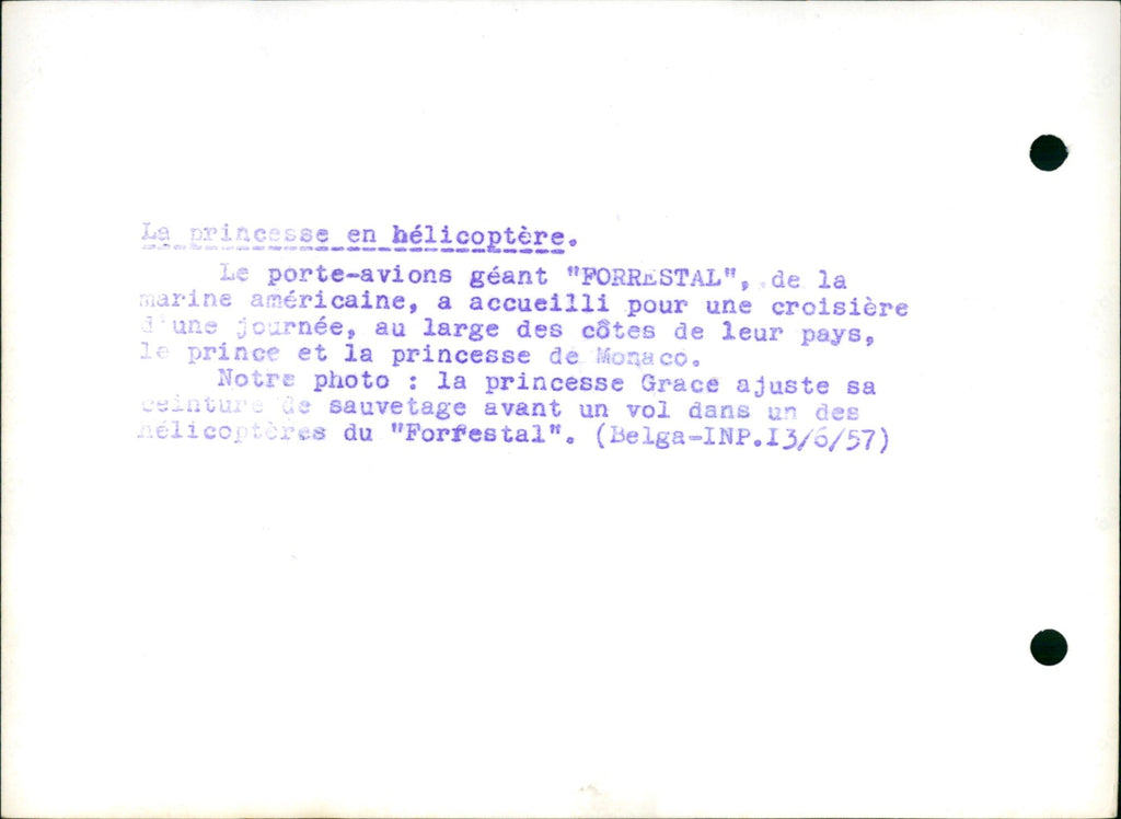 The giant aircraft carrier "Forrestal" of the American Navy, welcomed for, a 3 day cruise off the coast of their country, the Prince and Princess of Monaco. Our photo: Princess Grace adjusts her life belt before a flight in one of the "Forrestal" helicopters.