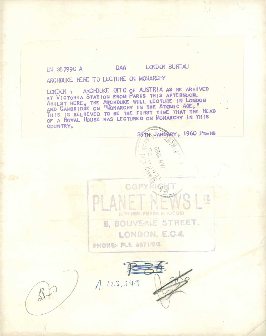 ARCHDUKE OTTO OF AUSTRIA AS HE ARRIVED AT VICTORIA STATION FROM PARIS THIS AFTERNOON WHILST HERE, THE AND CAMBRIDGE ON teMONARCHY IN THE ATOMIC AGE," THIS BELIEVED TO BE THE FIRST TIME THAT THE HEAD OF A RoYAL HousE HAS LECTURED ON MONARGHY IN THIS COUNTRY. ARCHDUKE WILL LECTURE IN LONDON. ARCHDUKE OTTO OF AUSTRIA AS HE ARRIVED AT VICTORIA STATION FROM PARIS THIS AFTERNOON WHILST HERE, THE AND CAMBRIDGE ON teMONARCHY IN THE ATOMIC AGE," THIS BELIEVED TO BE THE FIRST TIME THAT THE HEAD OF A RoYAL HousE HAS LECTURED ON MONARGHY IN THIS COUNTRY. ARCHDUKE WILL LECTURE IN LONDON.