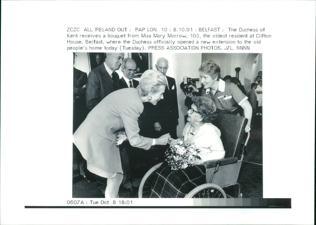Duchess of Kent receives a bouquet from Miss Mary Morrow 103, the oldest resident at Clifton House Belfest, where the Dutchess officially opened a new extension to the old people's home. Duchess of Kent receives a bouquet from Miss Mary Morrow 103, the oldest resident at Clifton House Belfest, where the Dutchess officially opened a new extension to the old people's home.