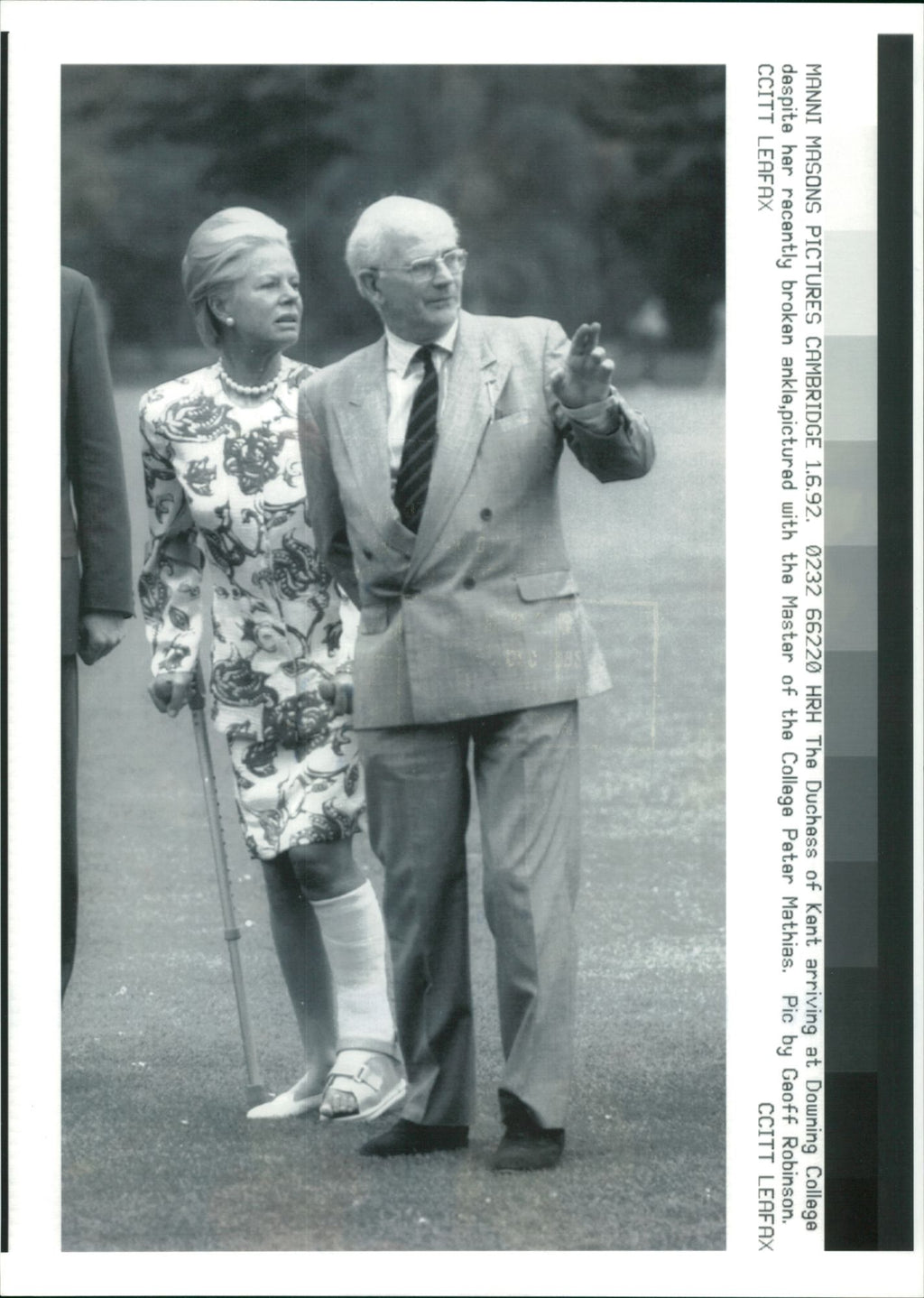 The Duchess of Kent arriving at Dowing College despite her broken ankle , pictured with Master of the College Peter Mathias. The Duchess of Kent arriving at Dowing College despite her broken ankle , pictured with Master of the College Peter Mathias.