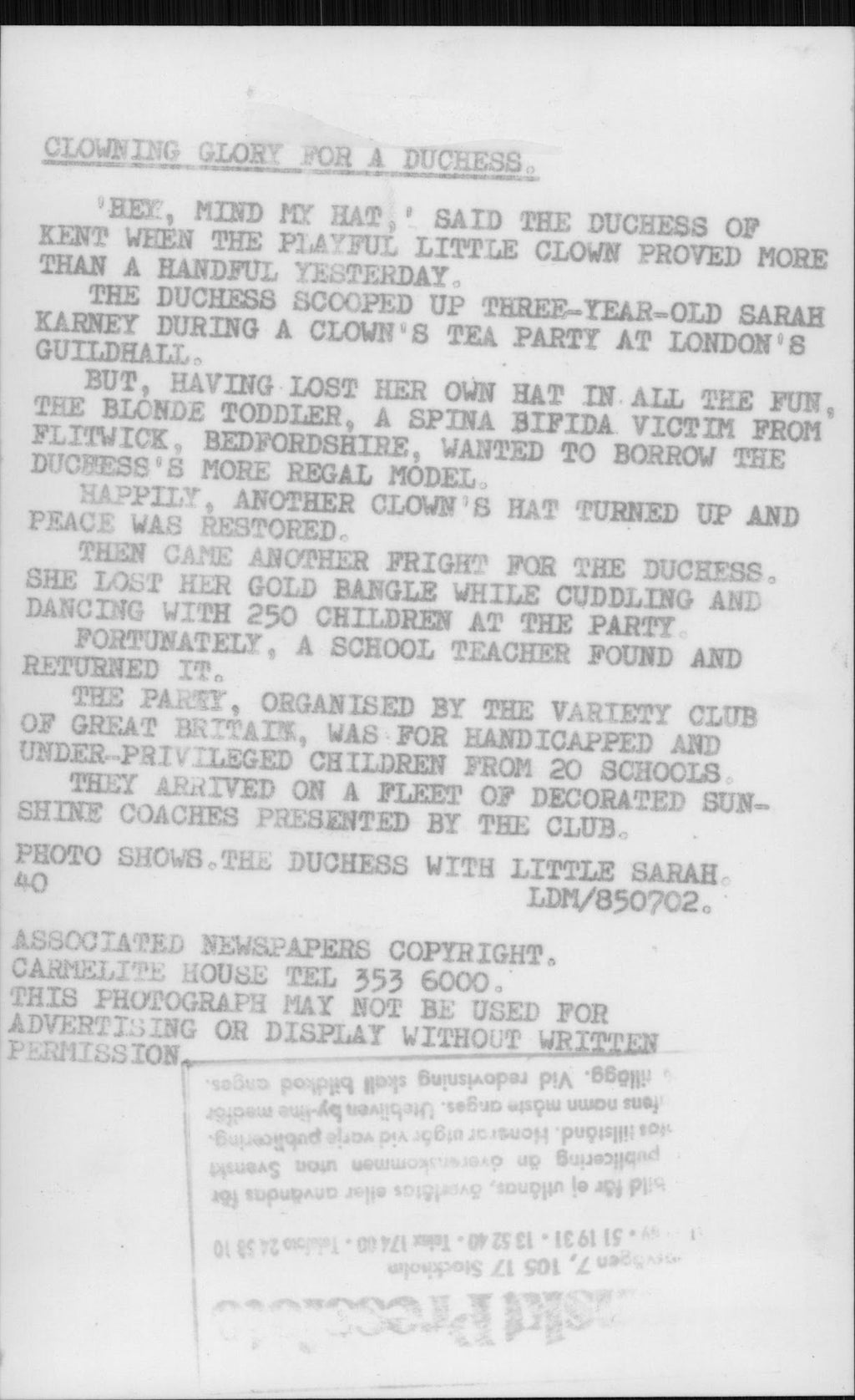 All our press photos are LIMITED ARCHIVE ORIGINALS - they are the actual prints that were used by the newspapers, they are not reprints or digital prints produced by us. All the prints are at least 30 years old and up to 100 years old.