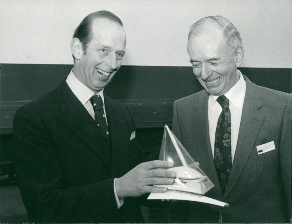 The Duke receives a commemorative pen set from managing director Mr. Ron Carter during his visit to Berol.
