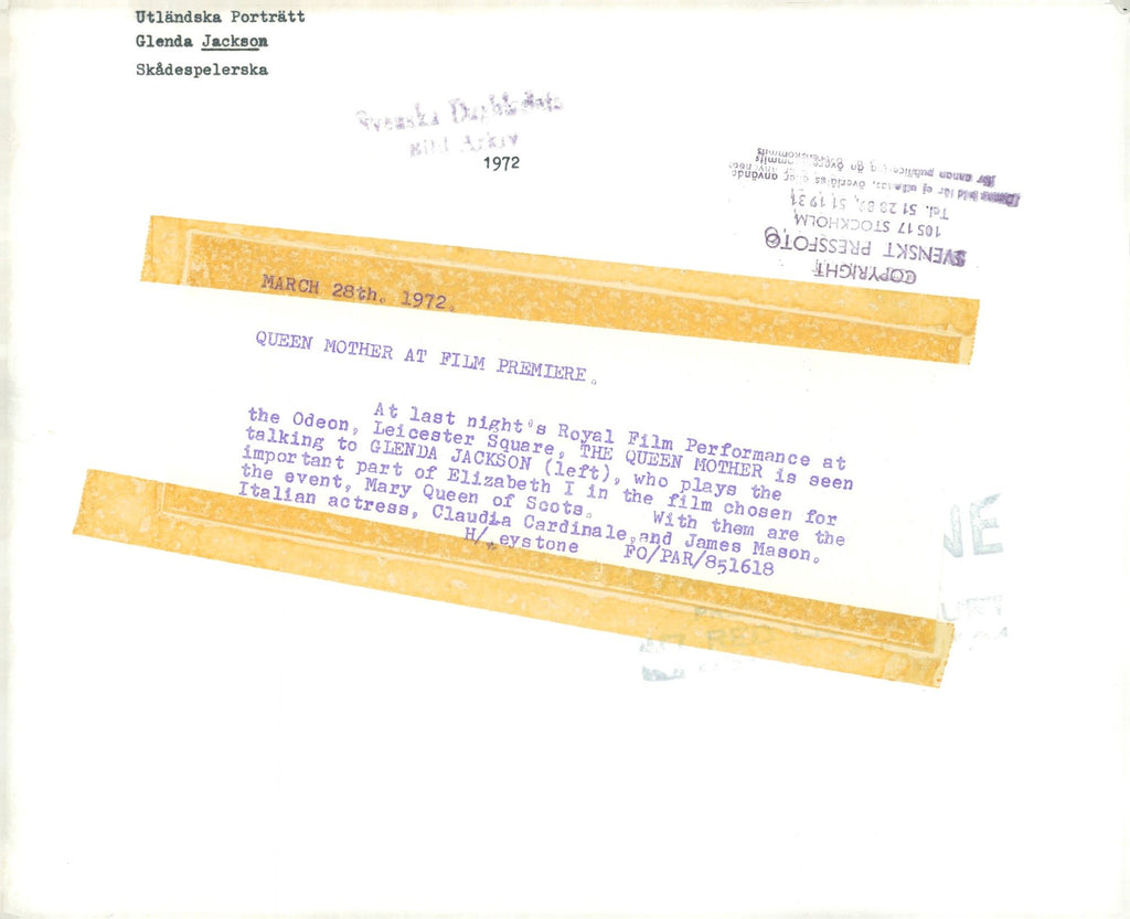 Glenda Jackson talks with Queen Elizabeth, Queen Mother, at the film premiere of "Mary Queen of Scots" - Vintage Photograph