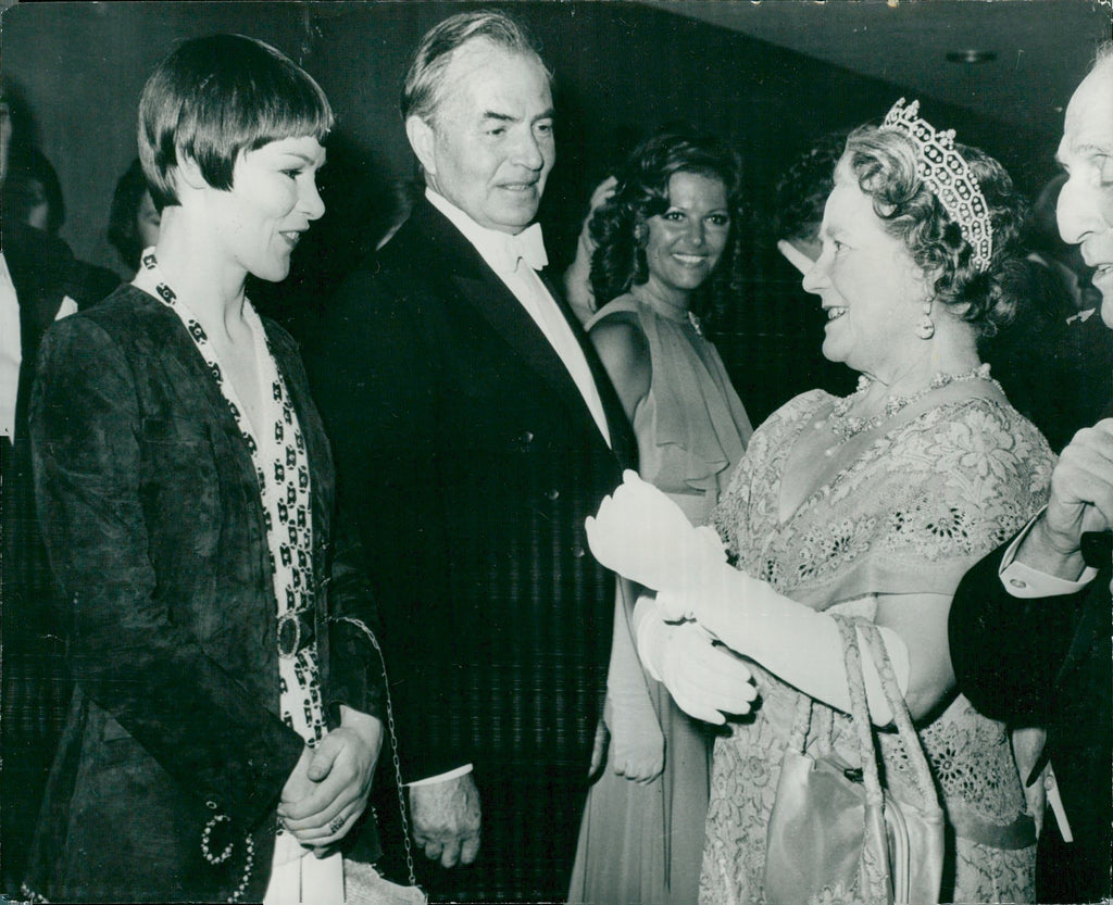 Glenda Jackson talks with Queen Elizabeth, Queen Mother, at the film premiere of "Mary Queen of Scots" Glenda Jackson, Actress