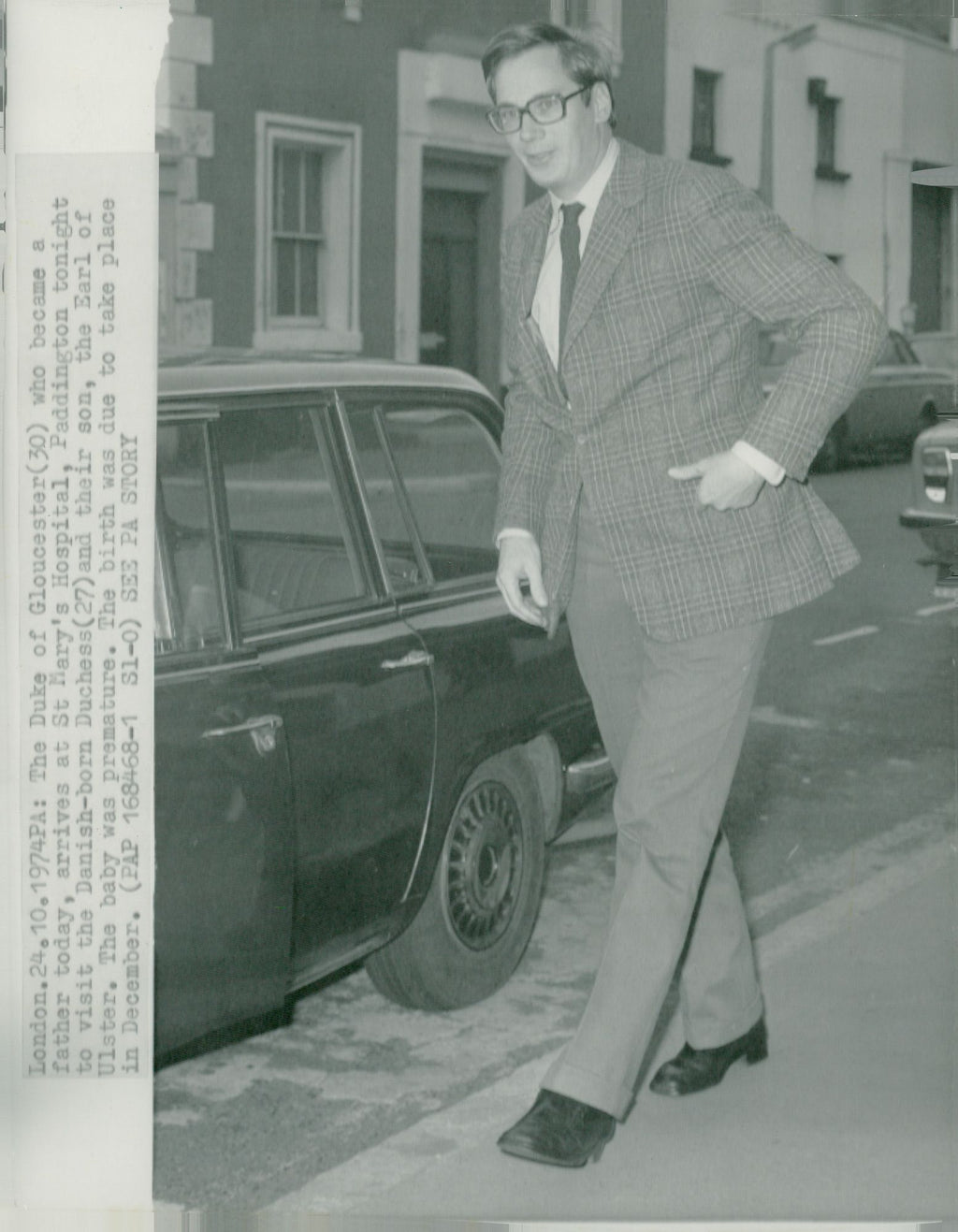 The Duke of Gloucester (30) who became a father today, arrives at St. Mary's Hospital, Paddington to visit the Danish-born Duchess (27) and their son, the Earl of Ulster. The baby was premature. The birth was due to take place in December.