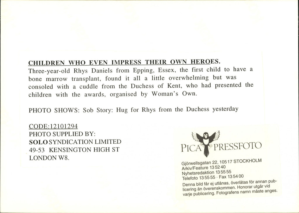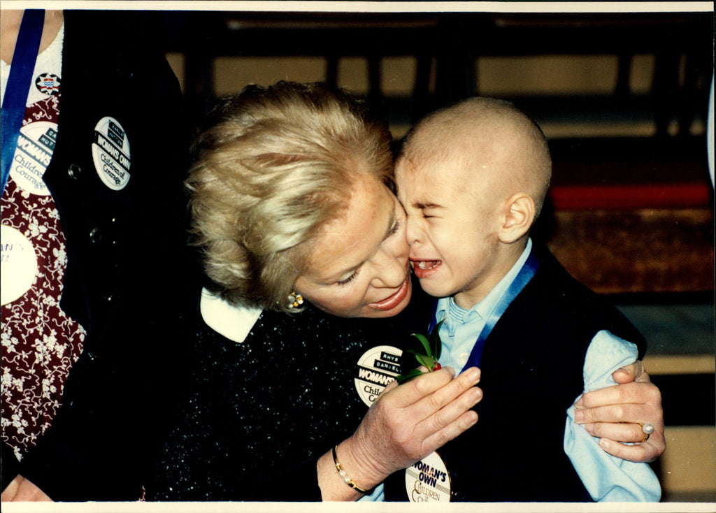 Katharine, the Duchess of Kent, hugs about a little boy to undergo a transplant. - Vintage Photograph